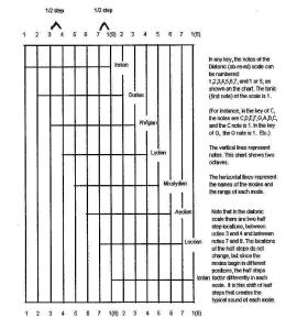 Below is a chart to help you see and understand the modes clearly. The top line of the chart shows the position of whole steps and half steps on a piano or harp. You don’t have to do anything special to get the whole steps or half steps; they are inherent in the tuning of the instrument and will automatically occur on the white keys of the piano or the strings of the harp tuned to C.